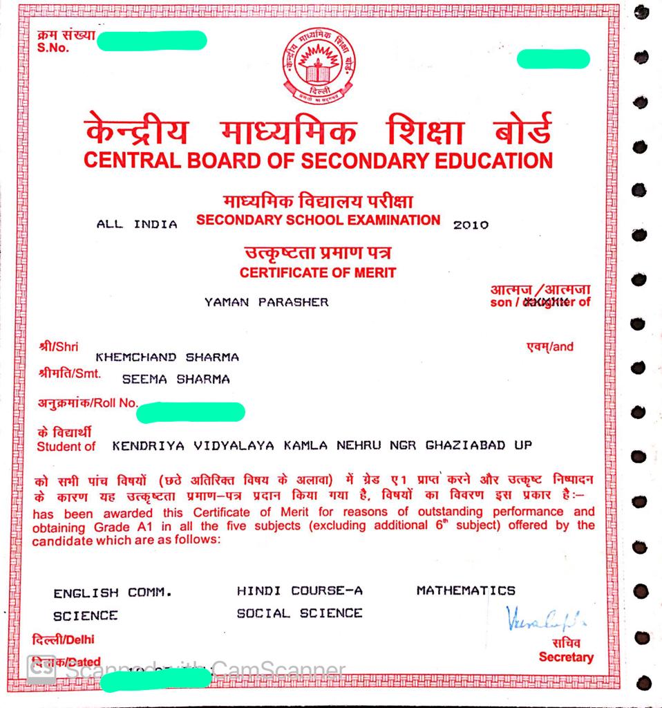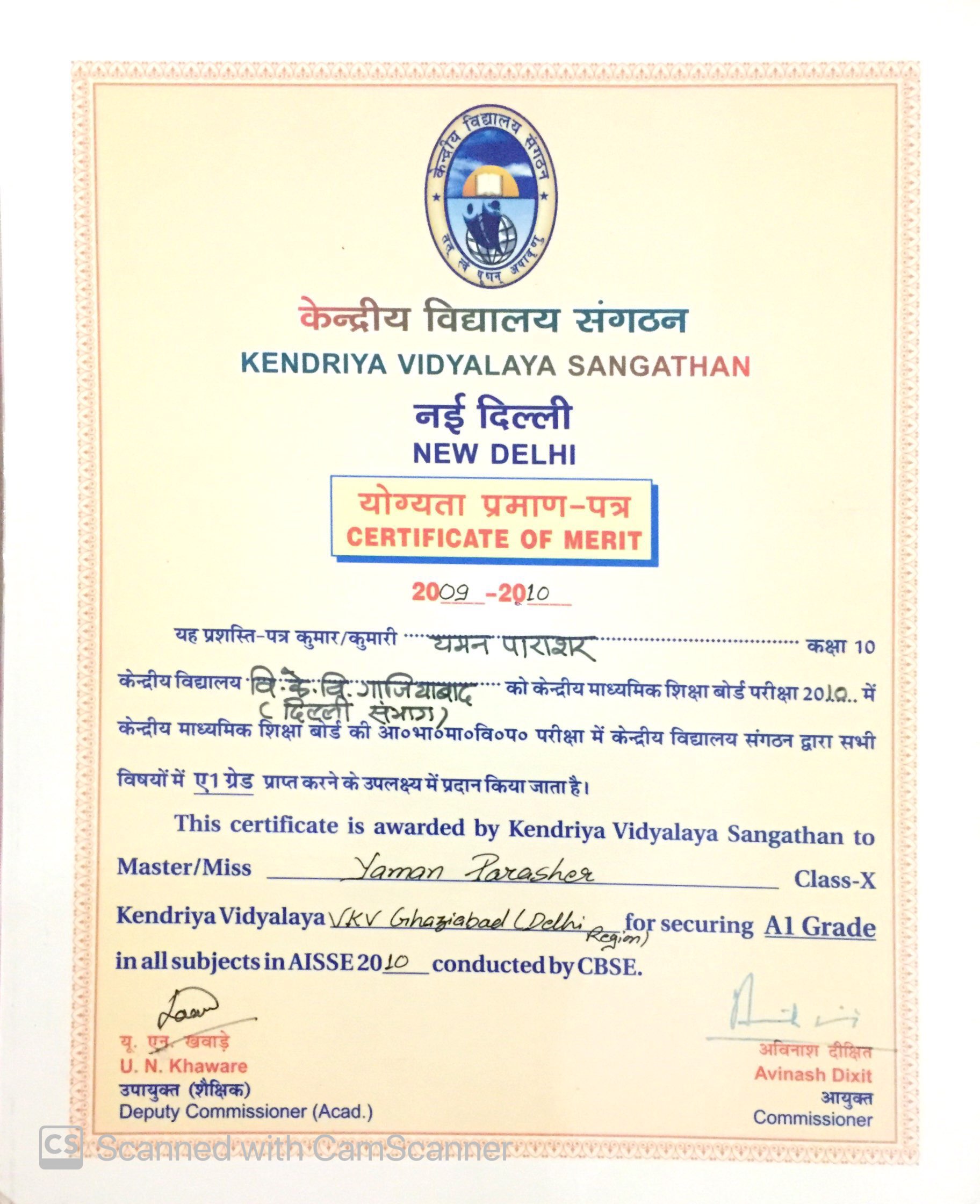 I was awarded Merit Certificates by Central Board of Secondary Education (CBSE) and Kendriya Vidyalaya Sangathan (KVS) for being for scoring 10/10 CGPA which put me in the top 0.1% of candidates passing All India Secondary School Examination (Class X) 2010. Below you can find photos of my merit certificates
