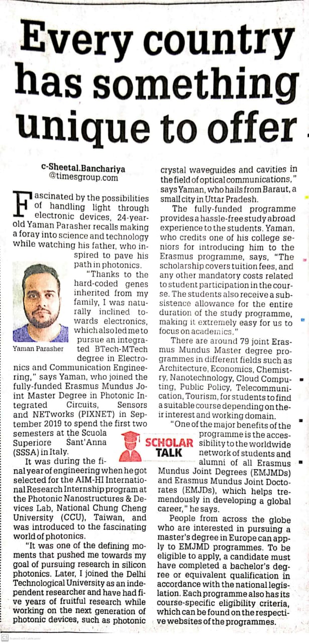Sept. 2019 - August 2021 Erasmus Mundus Scholarship Photonic Integated Circuits, Sensors & NetworksErasmus Mundus is a prestigious, integrated, international study program, jointly delivered by an international consortium of higher education institutions in Europe that aims to bring a high level of exposure to a student in every aspect. In this, students from around the world compete for a limited number of scholarships when the annual selection rounds open. The program is very competitive, and the best candidates from different countries are admitted to the program. One of the main USP of this program is the accessibility to the worldwide network of all students and alumni of all Erasmus Mundus Joint Degrees (EMJMDs) and Erasmus Mundus Joint Doctorates (EMJDs) from around the world, which of course is very important for the career growth.